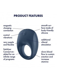 Shtoni pasion dhe sensualitet në burrërinë tuaj me Satisfyer's Strong One. i Qëndrueshëm fleksibël, unaza përshtatet me të gjitha madhësitë dhe përqafon penisin duke krijuar një tension emocionues dhe kënaqësi të zgjatur. Përkëdhelni veten dhe zemrën tuaj me një unazë miqësore me lëkurën që stimulon të dy ju me dridhje të fuqishme. Pasi të vendoset në penis intensifikon ereksionin dhe në të njëjtën kohë vonon derdhjen, për kënaqësi maksimale. Lodra e strukturuar imët qëndron mbi klitor me çdo goditje dhe siguron stimulim shtesë. Aplikacioni falas Satisfyer Connect ju jep edhe më shumë mundësi: mund të krijoni programe të reja dridhjeje, të shkëmbeni ide me përdorues të tjerë nga e gjithë bota dhe shumë më tepër!